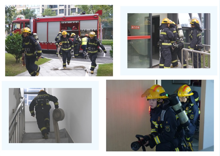 隨后進入實戰演練環節,模擬辦公樓突發火情,消防控制室在接報后立即啟動應急預案,消防站隊員迅速抵達現場展開撲救,同時引導假設受困人員沿疏散通道撤離。整個演練過程銜接緊密、響應迅速,有效檢驗了企業應急預案的可行性與現場救援的協同處置能力。