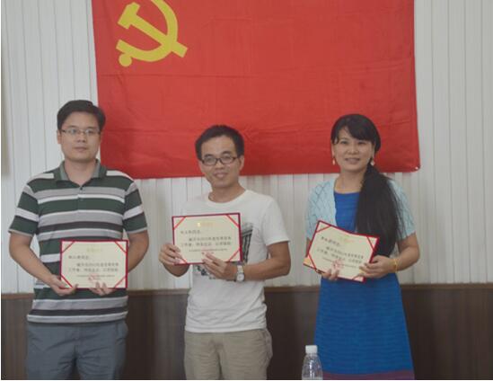 下圖為優(yōu)秀黨務工作者獲得者,左起:程江濤、劉立凱、李虹蔚